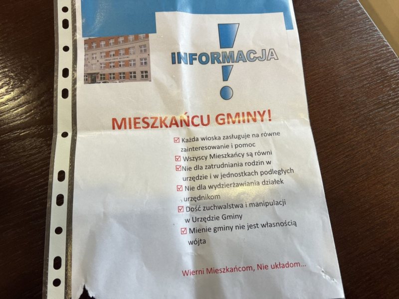 Na ulotce, wyglądającej jak obwieszczenie o przerwach w dostawie prądu pojawiło się sześć punktów: „Każda wioska zasługuje na równe zainteresowanie i pomoc, Wszyscy Mieszkańcy są równi, Nie dla zatrudniania rodzin w urzędzie i w jednostkach podległych, Nie dla wydzierżawiania działek urzędnikom, Dość zuchwalstwa i manipulacji w Urzędzie Gminy, Mienie gminy nie jest własnością wójta”.