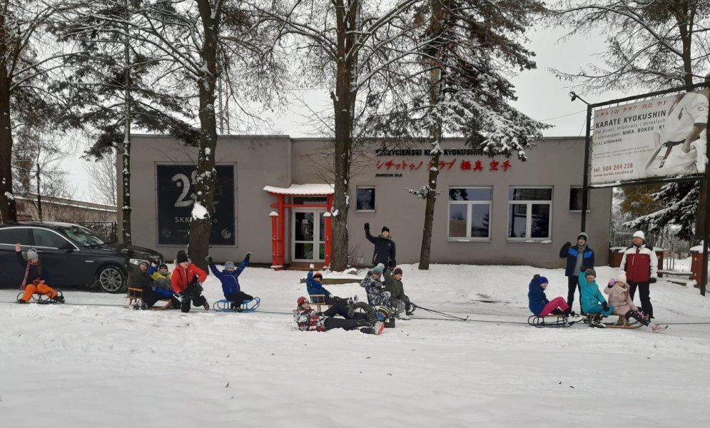 Uczestnicy „Ferii z karate kyokushin" mogli sprawdzić na własnej skórze, czego nauczyli się podczas zajęć, bowiem instruktorzy SKKK zorganizowali gry i zabawy na śniegu zakończone kuligiem. Choć tego dnia było dosyć zimno, to uśmiech na twarzach najmłodszych gościł do samego końca.
