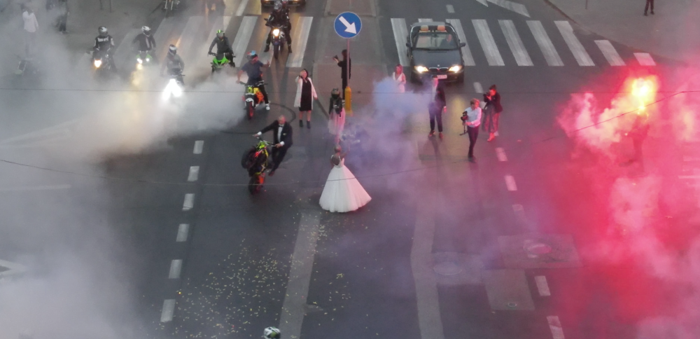 Sam przejazd weselników raczej nikomu nie przeszkadzał, ale to, co stało się w centrum Szczytna, na głównym świetlnym skrzyżowaniu, już niektórym doskwierało. Drogi zostały zablokowane głównie przez motocyklistów uczestniczących w wydarzeniu. Na środku skrzyżowania stanęła panna młoda, a wokół niej „tańczył” na motocyklu kek wybranek.