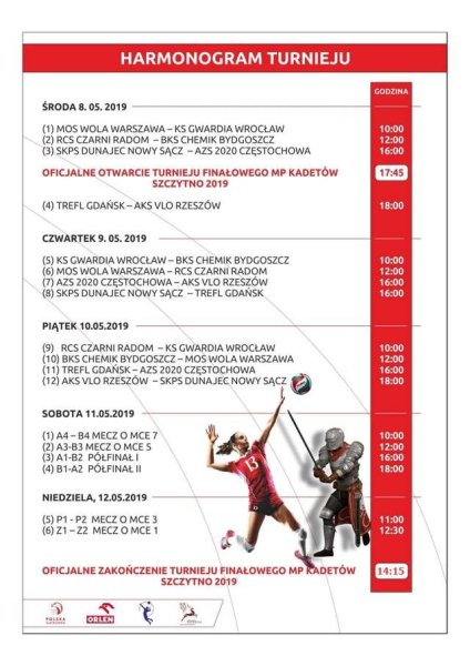 Do Szczytna przyjedzie osiem najlepszych siatkarskich drużyn. Zawodnicy to kadeci, czyli są w wieku 14-15 lat. W Szczytnie rozegrają łącznie 18 meczów (poniżej harmonogram spotkań). Finał zaplanowano na niedzielę na godz. 12.30.