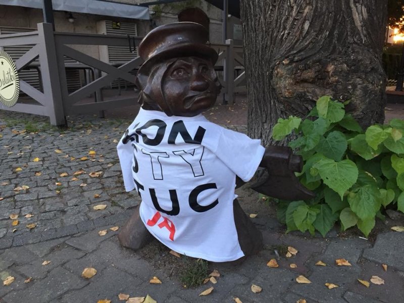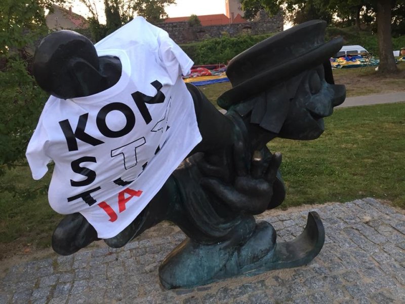 Sienkiewicz, Klenczon i szczycieńskie pofajdoki „włączyli” się w ogólnopolski protest przeciwko łamaniu konstytucji. W piątek rano miejskie pomniki ktoś „poubierał” w koszulki z napisem „KonsTytucJa”.