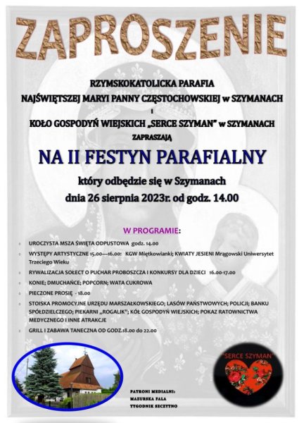 Pieczony prosiak, kuchnia polowa z grochówką i bigosem, ciasta, grill, chleb własnej roboty, ogórki, smalczyk... ale też i wspólna modlitwa – tak będzie wyglądał II Festyn Parafialny w Parafii Najświętsze Maryi Panny Częstochowskiej w Szymanach. Wydarzenie odbędzie się w sobotę, 26 sierpnia, w godzinach od 14 do 22. Miejsce – teren zielony przy rampie PKP w Szymanach.