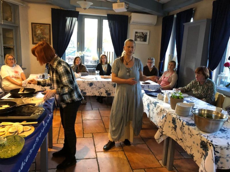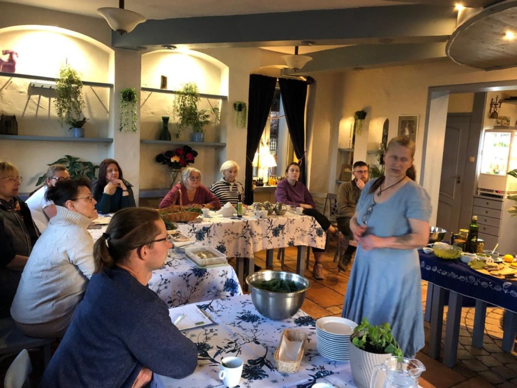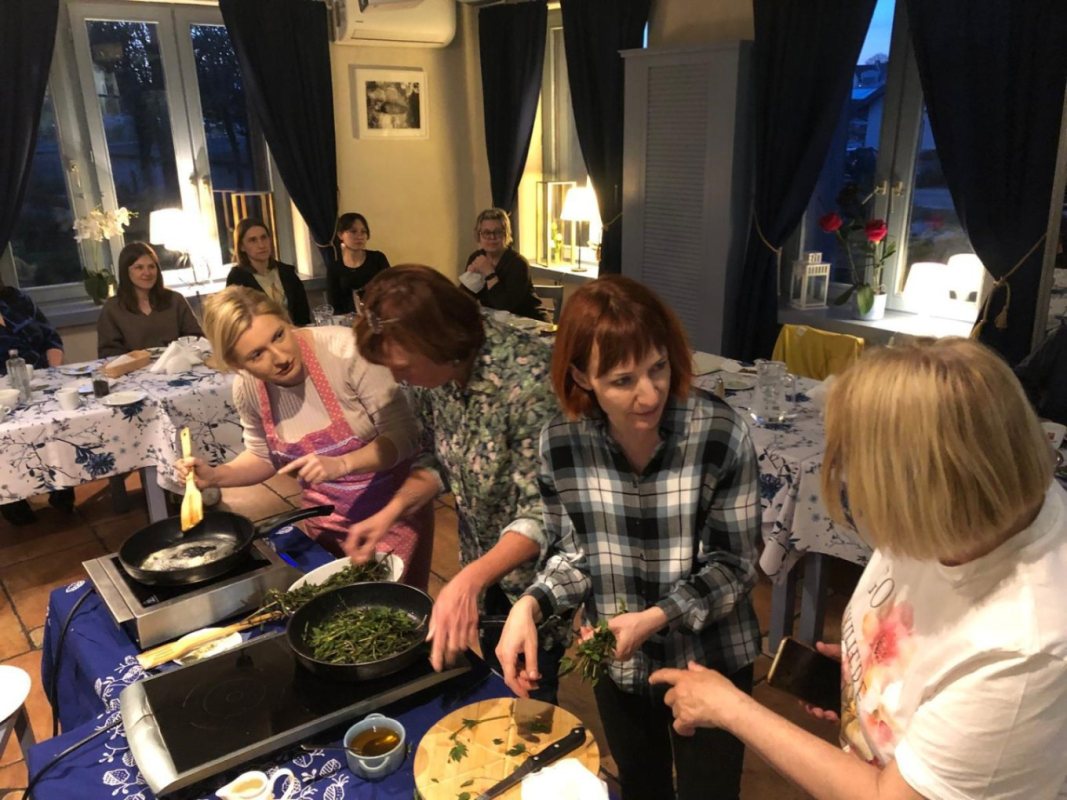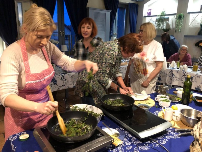 - Nie było teorii bez praktyki - śmieje się Joanna Zembrzuska, właścicielka Restauracji Niebieski Zaułek w Szczytnie i pomysłodawczyni zajęć. - Było gotowanie, próbowanie i rozmowy przy wspólnym stole. Menu powstawało na bieżąco, z sezonowych składników. Na stołach pojawiły się m.in. krem z pokrzywy, placuszki z fermentowanej gryki i pesto z podagrycznika z dodatkiem czosnku niedźwiedziego.