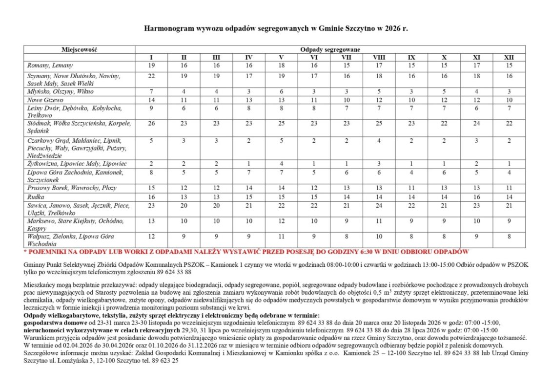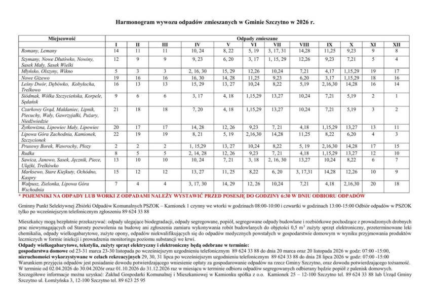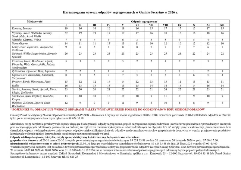 Mieszkańcy gminy Szczytno mogą już planować przyszły rok. Urząd Gminy opublikował szczegółowy harmonogram wywozu odpadów na 2026 rok – osobno dla odpadów zmieszanych i segregowanych, z podziałem na wszystkie miejscowości.