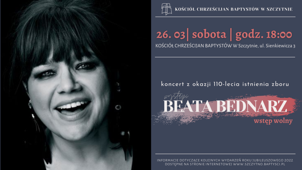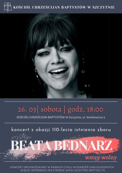 Na sobotę, 26 marca zaplanowano w Szczytnie koncert Beaty Bednarz. Odbędzie się on w kościele Chrześcijan Baptystów znajdującym się przy ulicy Sienkiewicz. Wspólnota Baptystów w naszym mieście obchodzi w tym roku 110-lecie istnienia.