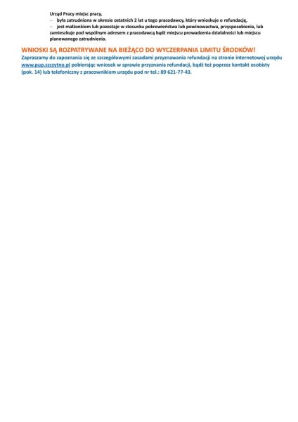 Zapraszamy do zapoznania się ze szczegółowymi zasadami przyznawania refundacji na stronie internetowej urzędu www.pup.szczytno.pl pobierając wniosek w sprawie przyznania refundacji, bądź też poprzez kontakt osobisty (pok. 14) lub telefoniczny z pracownikiem urzędu pod nr tel.: 89 621-77-43.