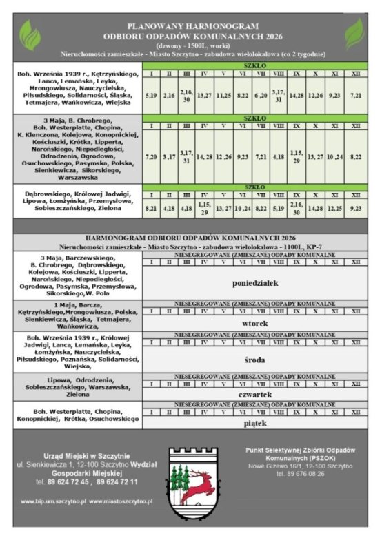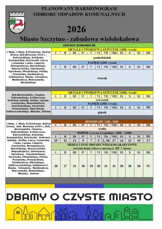 Nowe harmonogramy obejmują zarówno zabudowę jednorodzinną, jak i wielolokalową. Zawierają dokładne daty odbioru odpadów zmieszanych, selektywnych, bioodpadów, popiołu oraz gabarytów. Miasto przypomina, że odpady należy wystawiać w dniu odbioru, do godziny 6.00 rano.