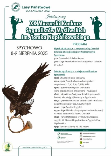 W sobotę, 9 sierpnia, wydarzenia przeniosą się do amfiteatru w Spychowie. Przesłuchania zespołów, warsztaty edukacyjne, uroczysty przemarsz pocztów sztandarowych oraz msza święta w Kościele pw. Matki Boskiej Nieustającej Pomocy stworzą niepowtarzalny klimat wydarzenia. Uroczystość zwieńczy koncert galowy na 100 rogów myśliwskich – wyjątkowy muzyczny finał jubileuszowej edycji.