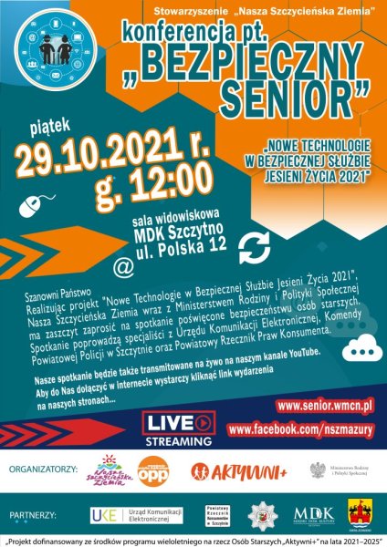 Zapraszamy w piątek, 29 października, o godz. 12:00 do sali widowiskowej Miejskiego Domu Kultury w Szczytnie. Zależy nam na tym, aby przyszło jak najwięcej seniorów, gdyż organizujemy to właśnie z myślą o nich. Dla tych, którzy jednak nie mogą się zjawić osobiście, mamy dobrą wiadomość. Całe wydarzenie będzie transmitowane na żywo w związku z czym można do Nas dołączyć za pośrednictwem internetu odwiedzając nasz profil Facebook www.facebook.com/nszmazury lub stronę Naszego projektu www.senior.wmcn.pl.
