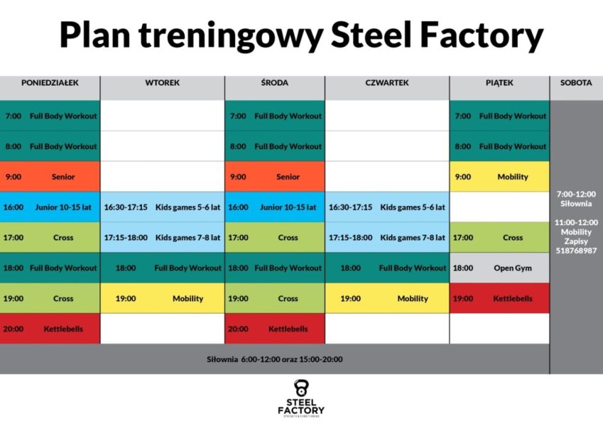 reklama. Szukasz klubu, który łączy innowacyjność z efektywnością? Gdzie każdy, bez względu na wiek, znajdzie coś dla siebie? Steel Factory 12-100 to odpowiedź na Twoje potrzeby! Zajęcia dla dzieci, młodzieży, dorosłych i seniorów – nasz klub to przestrzeń, gdzie sport staje się pasją i źródłem energii na co dzień.