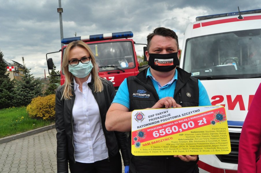 Strażacy z OSP Faryny wsparli pogotowie ratunkowe w Szczytnie kwotą 6560 zł. Prezent przekazali w dniu swojego święta, czyli 4 maja. Pieniądze mają doposażyć karetki w sprzęt do walki z koronawirusem. - Owszem, to my dziś świętujemy, ale czasami więcej radości przynosi dawanie prezentów niż ich otrzymywanie – mówi Mariusz Drężek, prezes OSP Faryny.