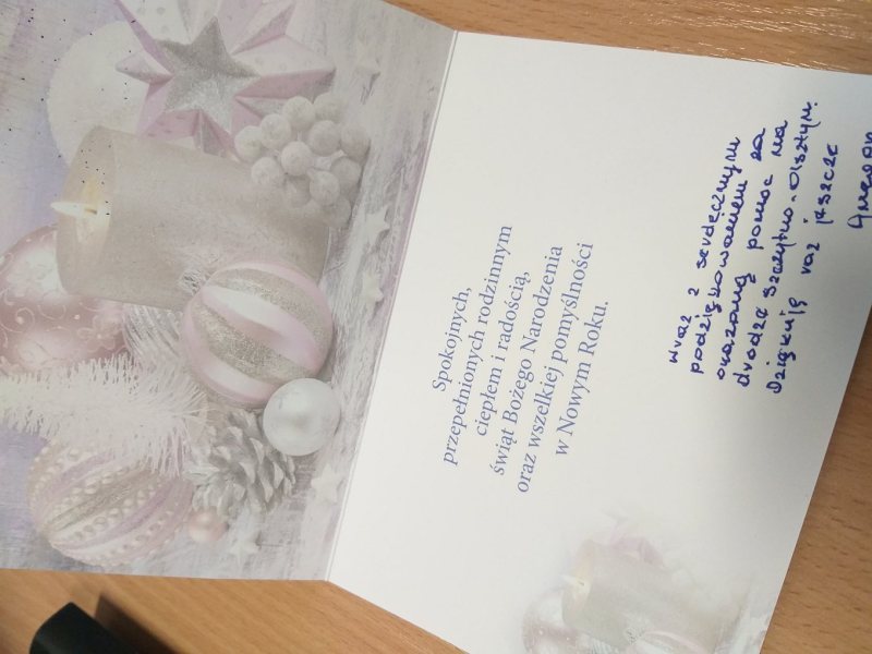 - Postawa szczycieńskiego funkcjonariusza pokazała, że policjantem jest się nie tylko na służbie – mówi sierżant Agata Stefaniak ze szczycieńskiej policji. - „Pomagamy i chronimy” to nie tylko hasło widoczne na policyjnych radiowozach, ale motto, którym kierują się policjanci w życiu codziennym. Mężczyzna, któremu pomógł nasz funkcjonariusz wykorzystując zbliżające się Święta Bożego Narodzenia, wysłał starszemu posterunkowemu kartkę świąteczną z życzeniami oraz podziękowaniem za okazaną pomoc. Bardzo miły gest.