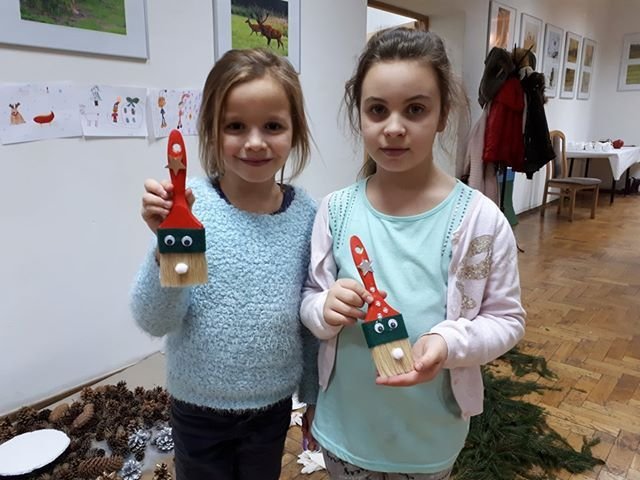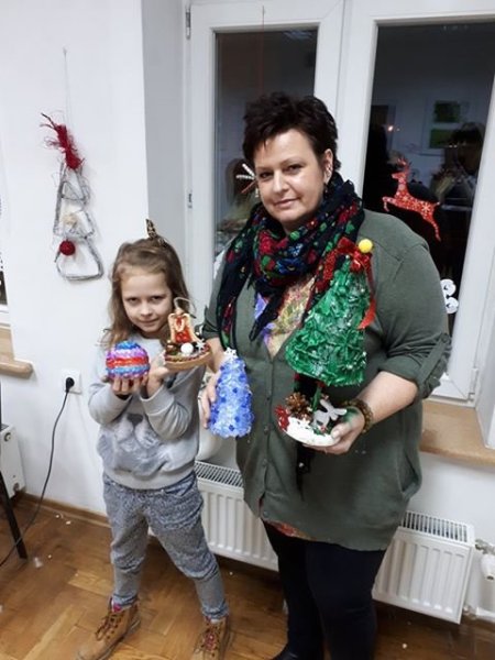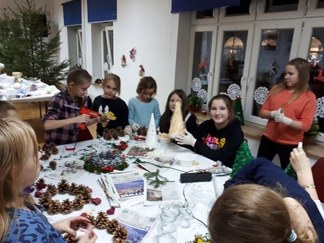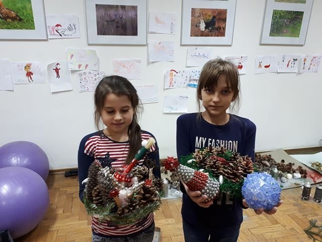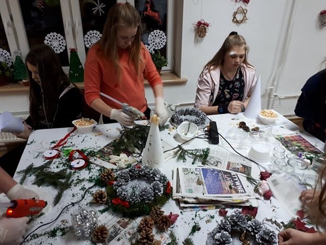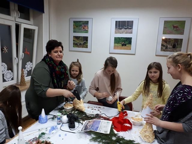 Uczestnicy z zapałem wykonywali ozdoby świąteczne, wykazując się przy tym wielką pomysłowością. Powstały stroiki, choinki z piórek a nawet trocin, bombki, Mikołaje z pędzli, lampiony i dużo, dużo innych uroczych dekoracji.