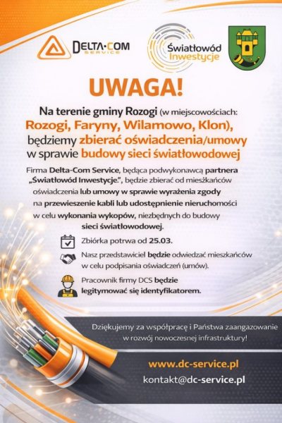 Pracownicy firmy DeltaCom odwiedzają mieszkańców Rozóg, Faryn, Wilamowa i Klonu. Zbierają zgody potrzebne do budowy sieci światłowodowej. Od tych podpisów zależy tempo inwestycji. Pierwsze wizyty już się zaczęły. Przedstawiciele firmy DeltaCom pojawiają się w domach mieszkańców i proszą o podpisanie dokumentów.