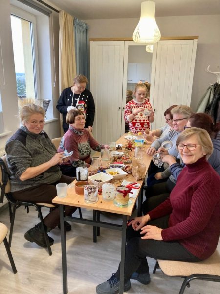 Seniorzy podczas zajęć według własnego pomysłu projektowali i komponowali kolorowe, pachnące świece podczas warsztatów, zorganizowanych przez bibliotekę w Lipowcu.