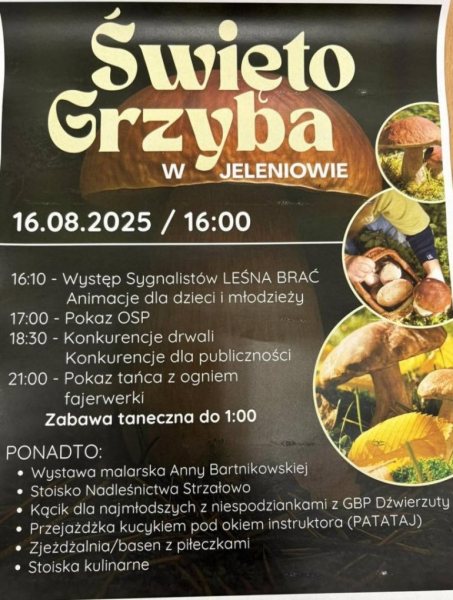 W sobotę, 16 sierpnia, Jeleniowo zamieni się w stolicę grzybiarzy i dobrej zabawy. O godzinie 16:10 imprezę otworzy występ sygnalistów Leśna Brać, a tuż po nim zaplanowano animacje dla dzieci i młodzieży.