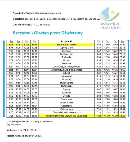 Linia obsługiwana przez firmę Faster obejmie m.in. Dźwierzuty, Rumy i inne miejscowości w regionie, zapewniając regularne połączenia dla mieszkańców. Nowy rozkład jazdy, obowiązujący od 9 stycznia 2025 roku, przewiduje kursy od poniedziałku do soboty, co z pewnością poprawi dostępność transportową dla mieszkańców, a także umożliwi łatwiejszy dojazd do pracy, szkół czy urzędów.
