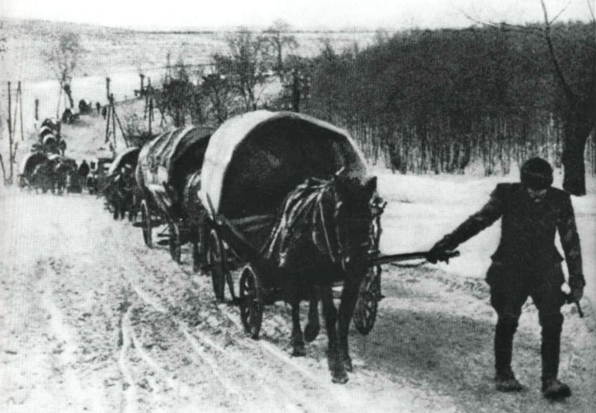 Nazajutrz rodzice wraz z Sonią i Mikołajem wyruszyli w dalszą drogę. Po poprzedniej kolumnie nie pozostał nawet ślad. Popołudniem dołączyli do kilku wozów zmierzających w kierunku Gdańska. – Podczas jednego z postojów rozpoczął się ostrzał taboru, w którym znajdowali się moi rodzice. Dobrze, że zwierzęta były wyprzęgnięte, ale w pewnym momencie mój ojciec zauważył, że plandeka, która chroniła wóz, wskutek ostrzału i wybuchów granatów, zaczęła się palić.