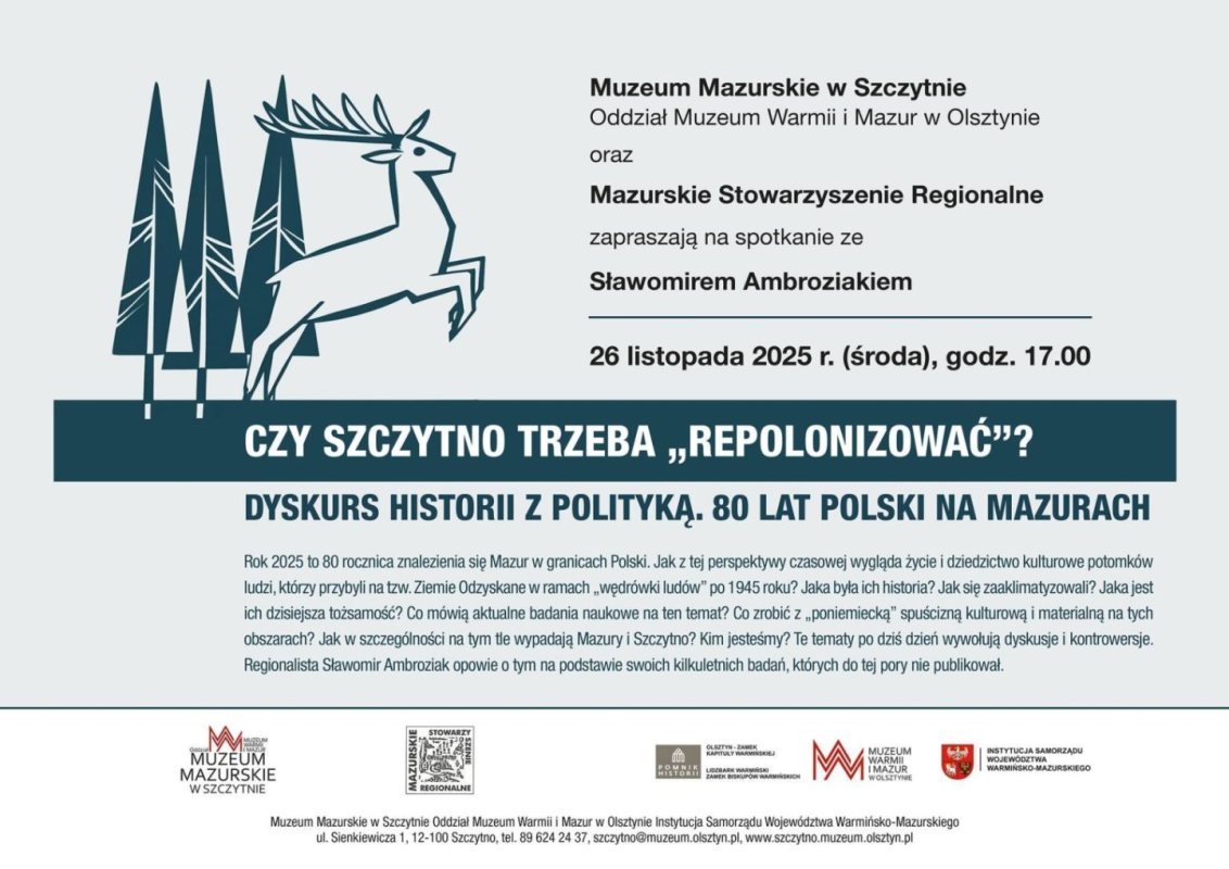 Słowo „repolonizacja” wraca do Szczytna jak bumerang. Raz w sporach o niemieckie nazwy w parku, innym razem w politycznych wystąpieniach, które grzeją emocje bardziej niż treść. 26 listopada w Muzeum Mazurskim w Szczytnie odbędzie się wykład Sławomira Ambroziaka – prawnika, regionalisty, autora książek o historii powiatu. O tym, czy Szczytno naprawdę trzeba repolonizować i skąd w ogóle wzięła się ta debata, rozmawiamy jeszcze przed spotkaniem. Odpowiedzi? Nie wszystkie padną dziś. Najważniejsze dopiero w muzeum.