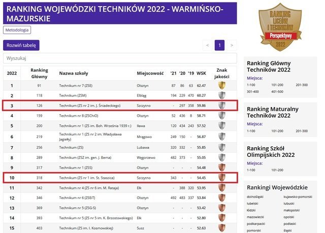 W przypadku szczycieńskich zespołów najlepszy wynik uzyskał Zespół Szkół nr 2 im. Jędrzeja Śniadeckiego: 59,88 punktów, co zapewniło 126 miejsce w kraju i 3 miejsce w województwie (na 52 oceniane). Wynik tym bardziej godny, że szkoła nie miała olimpijczyków z liczącymi się laurami i w ramach tego kryterium nie uzyskała żadnych punktów. Za to uzyskała bardzo wysoki wskaźnik dotyczący egzaminów zawodowych (97,73%). Warto też wspomnieć, że szkoła nie po raz pierwszy została w rankingu wyróżniona. Ma na swoim koncie tarcze brązowe, a także srebrną, otrzymaną w 2020 roku.