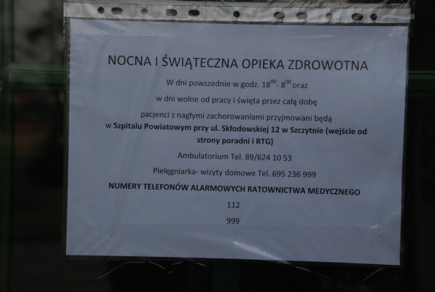 Od 1 marca usługi te świadczy szczycieński szpital. Lekarze w święta i w godzinach od 18 do 8 przyjmują pacjentów w budynku szpitala przy ulicy Skłodowskiej 12. Wejście do tego stacjonarnego „pogotowia” znajduje się od strony poradni i RTG.