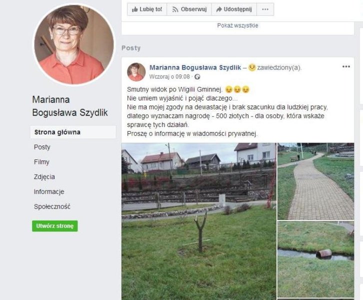 Sprawą zajmują się policjanci. Ten widok i czyn oburzył też wójt Mariannie Szydlik. Na swoim profilu facebookowym napisała: „Nie umiem wyjaśnić i pojąć dlaczego... Nie ma mojej zgody na dewastację i brak szacunku dla ludzkiej pracy, dlatego wyznaczam nagrodę - 500 złotych - dla osoby, która wskaże sprawcę tych działań. Proszę o informację w wiadomości prywatnej.”