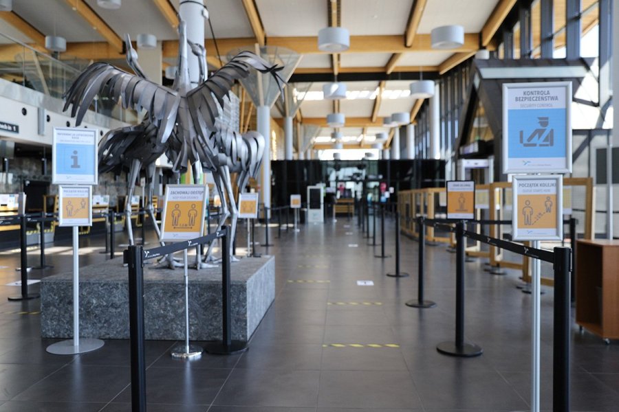 - w terminalu wyznaczono także nowe ścieżki poruszania się pasażerów, które zapewniają podróżnym bezpieczny dystans 1,5 m od innych osób. Pojawiły się znaczniki na podłogach, ścianach, fotelach i urządzeniach, dzięki którym pasażerowie będą mogli łatwiej przestrzegać obowiązujących na lotnisku zasad sanitarnych,