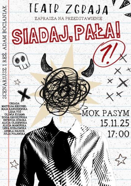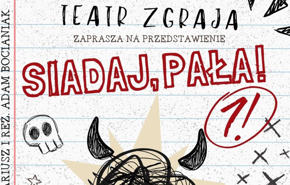 W sobotę, 15 listopada o godz. 17:00, w Miejskim Ośrodku Kultury w Pasymiu odbędzie się wznowienie spektaklu „Siadaj, pała!” w reżyserii i według scenariusza Adama Bocianiaka.