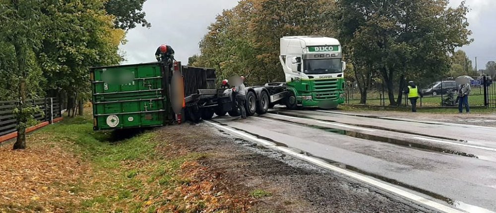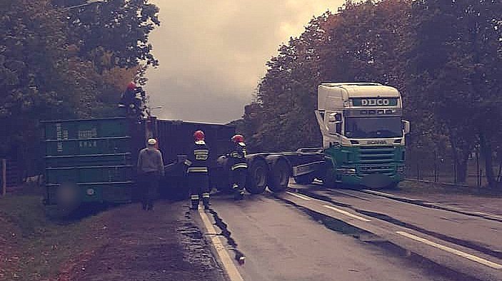 Około godziny 10.50 na trasie Olszyny – Szczytno doszło do wypadku z udziałem samochodu ciężarowego. Z naczepy auta spadł potężny kontener.