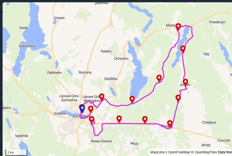 Trasa liczy 41 km (z sumą podejść 304 m) i prowadzi przez Szczytno, Lipową Górę Wschodnią, Lemany, Marksewo, Jerutki, Olszyny, a następnie wraca do miasta. Uczestnicy wyruszają samotnie lub w niewielkich grupach, unikają rozmów i skupiają się na modlitwie.
