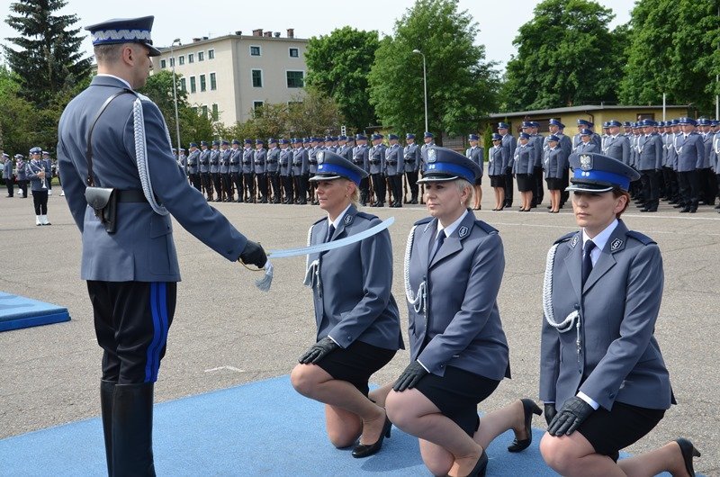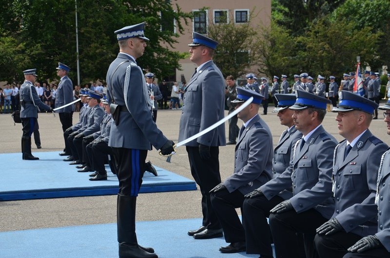 Następnie odbył się najważniejszy moment uroczystości, czyli mianowanie na pierwszy stopień oficerski. Tradycyjnego uderzenia szablą w ramię nowo mianowanych funkcjonariuszy dokonał nadinsp. dr Jarosław Szymczyk oraz nadinsp. Andrzej Szymczyk.