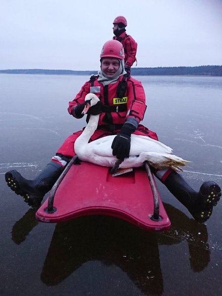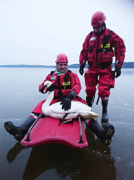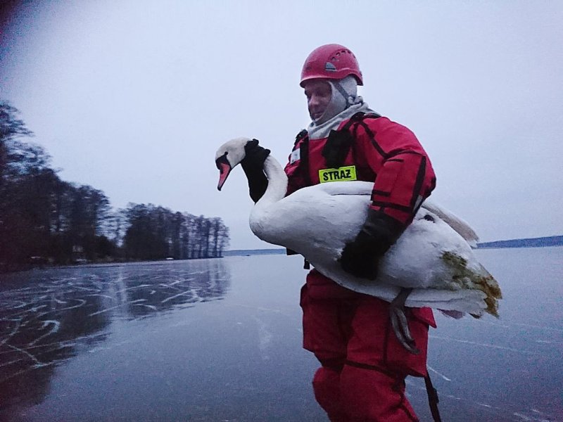 – Sytuacja nie jest prosta, bo jezioro w pobliżu łabędzia nie jest zamarznięte. Lód nie jest jeszcze dość mocny. Jest bardzo daleko. Nie wiemy jak gruby tam jest lód – mówi dowodzący na miejscu akcją strażak.