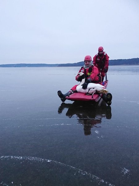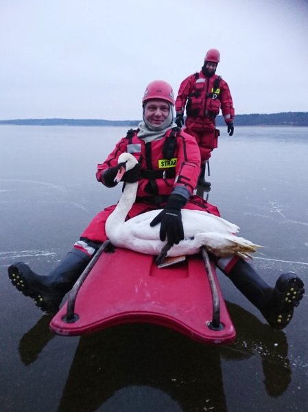 Dlatego strażacy podeszli do ptaka od strony, która już w znacznej części była zamarznięta.