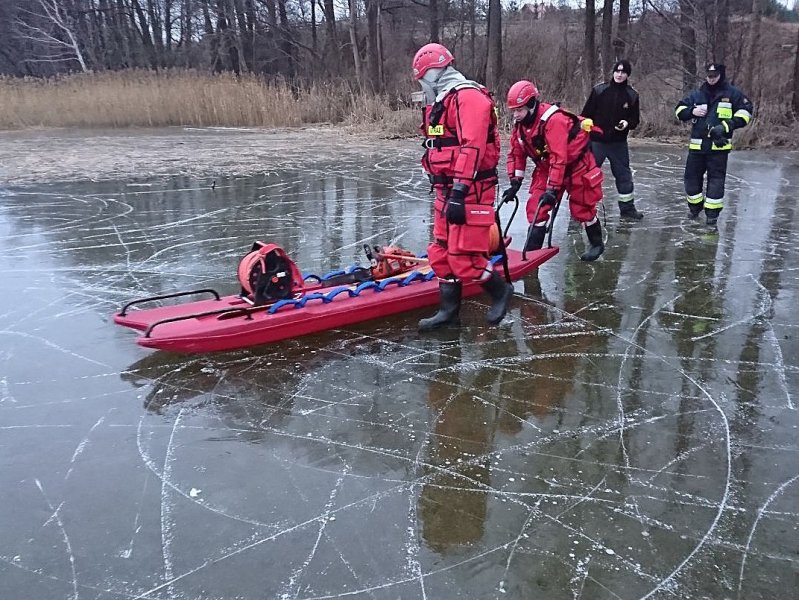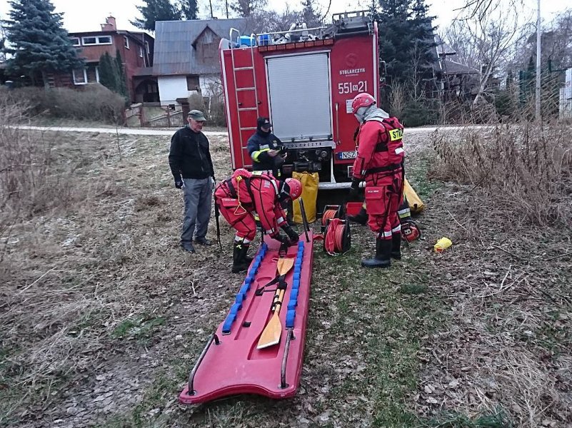 Około 30 minut od zgłoszenia zespół ratowników był już na miejscu. Było ok. g. 15. Po szybkiej ocenie sytuacji strażacy zaczęli wydobywać z pojazdu potrzebne sprzęty: „suche” skafandry, raki, sanie, liny, siekierę, nawet piłę motorową.