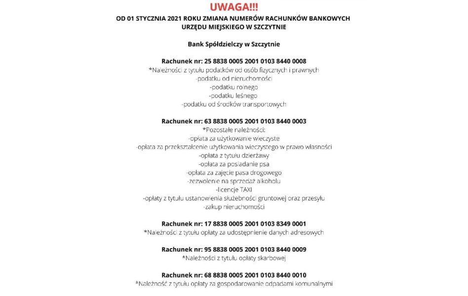 W rozpoznaniu cenowym wzięły udział dwie instytucje finansowe. Bank Spółdzielczy w Szczytnie pokonał w tej rywalizacji Bank Millennium SA. Od stycznia zmieniły się numery kont do opłat lokalnych (publikujemy je poniżej). Wykaz nowych numerów kont znajduje się też na BIP Miasta Szczytno https://bip.um.szczytno.pl/.