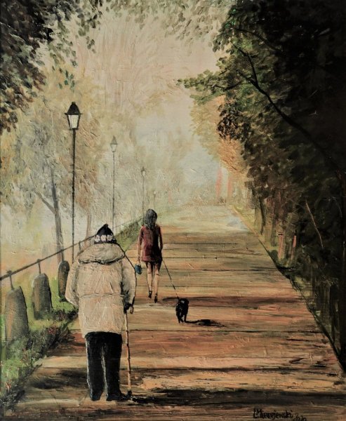 - No więc, kiedy człowiek przekracza próg swojej młodości? - dopytywała się wnuczka. - Jest to teoria nie do wytłumaczenia. Jedni twierdzą, że przekraczamy ten próg, gdy stajemy się obwiśli, pomarszczeni, brzydcy, nieelastyczni, otyli, chorzy na wszelakie choroby starcze. Inni mówią, że gdy zaczynamy podpierać się laską, jeszcze inni twierdzą, gdy nie mamy siły wbiec np. na drugie piętro po schodach, bez zadyszki. Zresztą popatrz na mój obraz, który namalowałem na plenerze malarskim w sierpniu 2020 roku w Żydowie. Przedstawia on wizerunek wiekowego, zniedołężniałego mężczyzny – chcącego nadążyć za młodą kobietą!