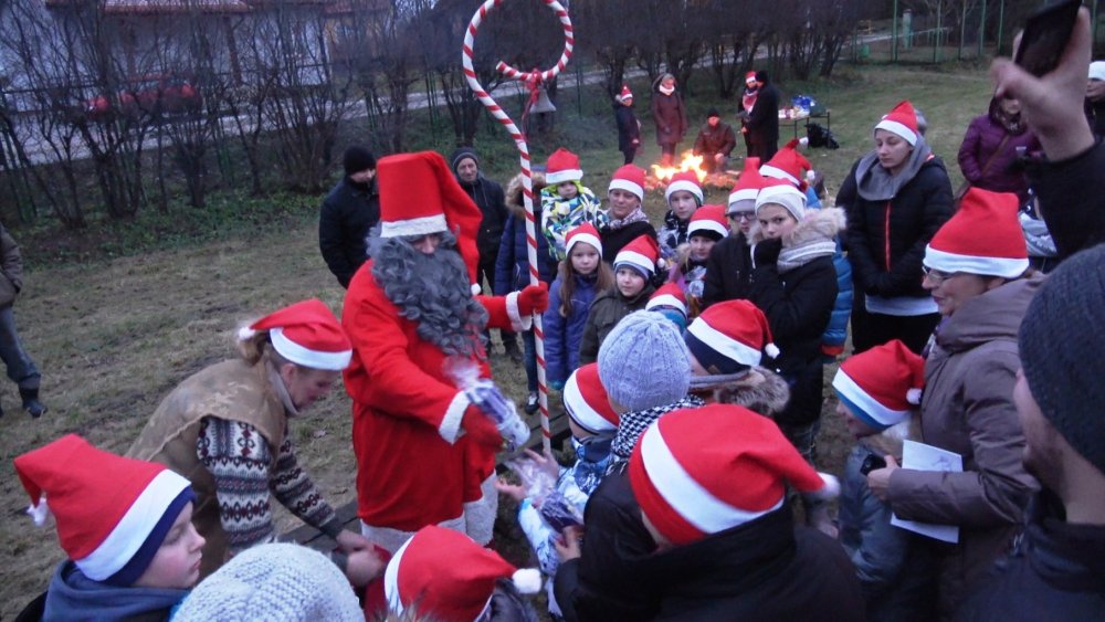 Po chwili rozpoczęły się sołeckie Mikołajki. Zadbano o stosowną oprawę: dzieci i dorośli mieli na głowach czerwone czapeczki, na placu pojawił się organista, Pan Zbigniew Sawczuk, który grając na akordeonie zaintonował kolędę. I nie wiedzieć skąd na plac, ku ogromnej radości dzieci, zawitał św. Mikołaj z dużym workiem prezentów. Oblężenie, śpiewy, tańce, wręczanie podarków, robienie zdjęć, ogólna radość, bo każdy przybyły otrzymał prezent. Obok płonęło ognisko, na którym można było upiec kiełbaskę, pod dachem stół ze słodkim poczęstunkiem, gorącą kawą i herbatą. Były też świąteczne dekoracje, świece, zimne ognie. Pomimo zmierzchu i chłodu wszyscy czuli się pogodnie, a wielu wyrażało radość z udziału we wspólnym, przedświątecznym spotkaniu.