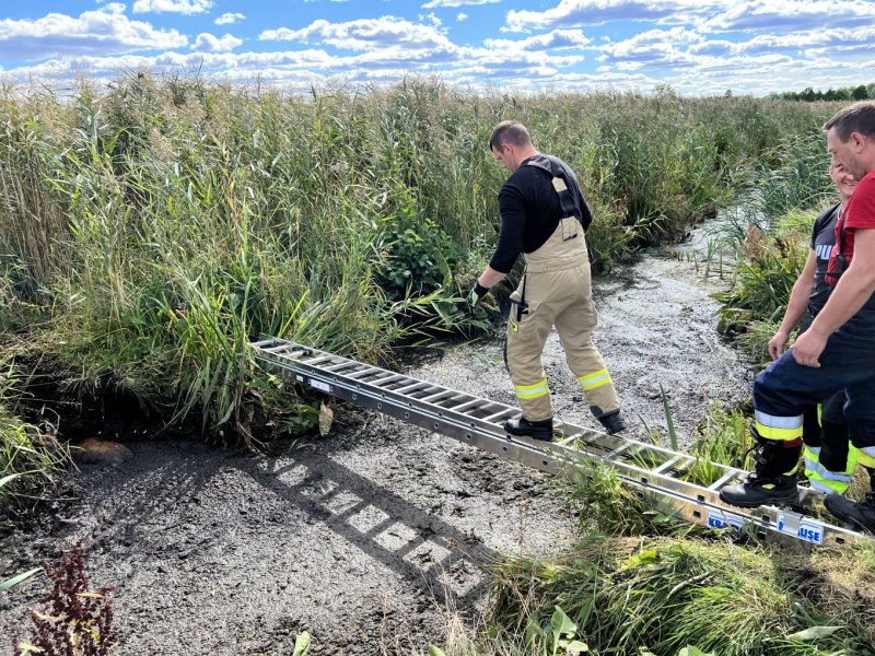 Rolnik powiadomił myśliwych, a ci o pomoc w uwolnieniu zwierząt poprosili strażaków.