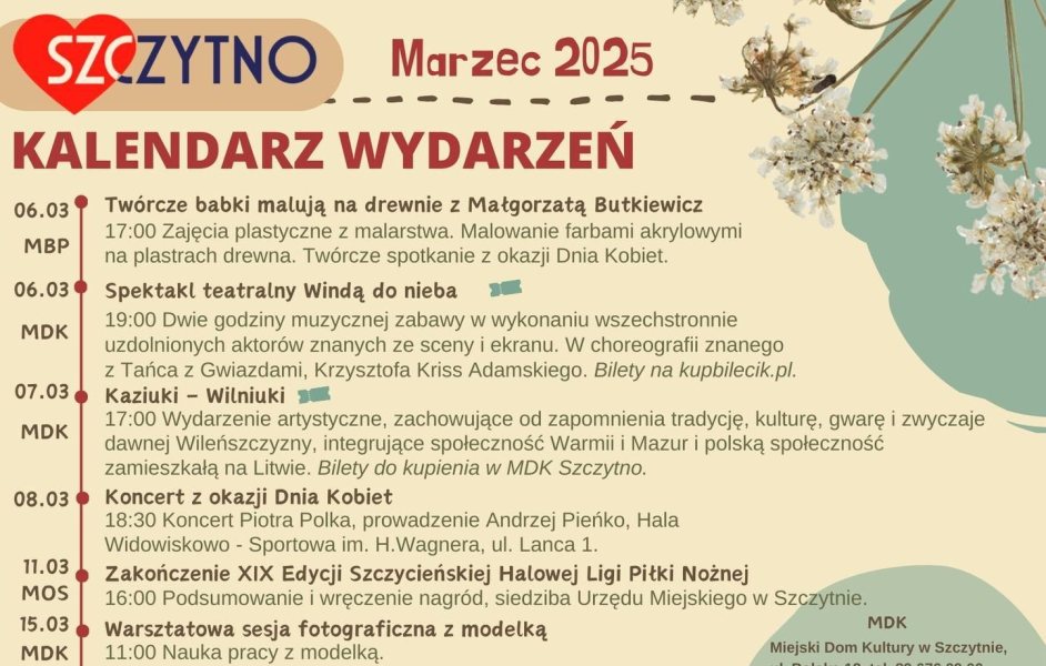 Miesiąc rozpocznie się twórczo – 6 marca odbędą się warsztaty malarskie z Małgorzatą Butkiewicz, a wieczorem w Miejskim Domu Kultury zobaczymy spektakl „Winda do nieba” w choreografii Krzysztofa Krissa Adamskiego.