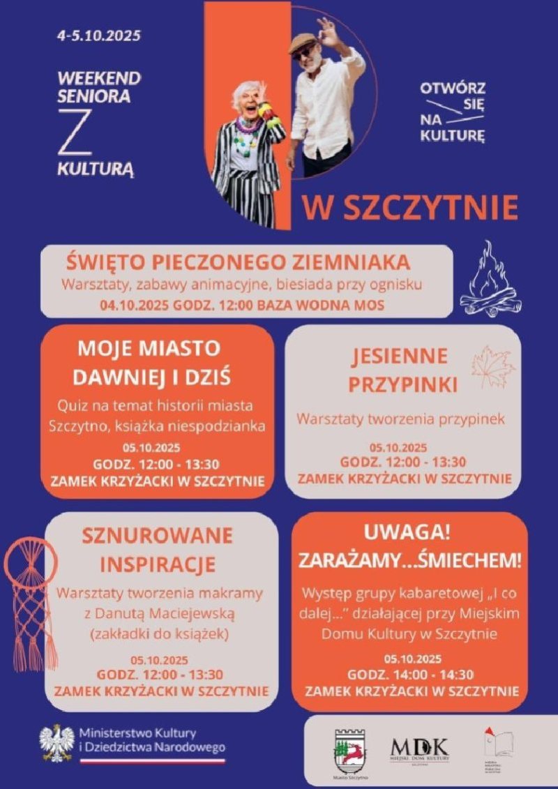 W pierwszy weekend października seniorzy z Szczytna i okolic spotkają się na wydarzeniach pod hasłem „Weekend seniora z kulturą”. Program rozłożono na dwa dni – 4 i 5 października – w Bazie Wodnej MOS i na terenie Zamku Krzyżackiego.