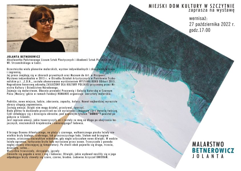 W czwartek, 27 października o godzinie 17:00 w Miejskim Domu Kultury w Szczytnie odbędzie się otwarcie wystawy malarstwa Jolanty Betnerowicz - absolwentki Państwowego Liceum Sztuk Plastycznych i Akademii Sztuk Pięknych im. Wł. Strzemińskiego w Łodzi, uczestniczki wielu plenerów malarskich, wystaw indywidualnych i zbiorowych w kraju i zagranicą. Wstęp wolny.