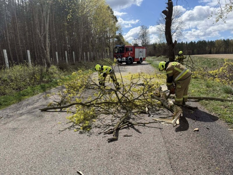 Poranek przyniósł kolejne zgłoszenia. O godz. 9:30 strażacy z OSP Szymany interweniowali w Ciemnej Dąbrowie, gdzie drzewo spadło bezpośrednio na jezdnię. Z kolei o 10:14 i 11:37 zastęp z Jedwabna dwukrotnie wyjeżdżał do niebezpiecznych konarów - najpierw na trasę Jedwabno–Burdąg, a następnie na ul. 1 Maja w Jedwabnie, gdzie dodatkowym zagrożeniem była częściowo zerwana napowietrzna linia telekomunikacyjna.