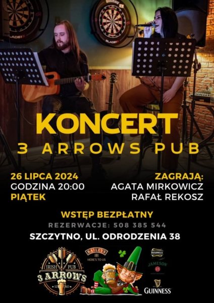 Przyjdź na niezapomniany koncert Agaty Mirkowicz i Rafała Rekosza! Już w piątek 26 lipca w 3 Arrows Pub w Szczytnie. Start o 20:00. Wstęp bezpłatny!