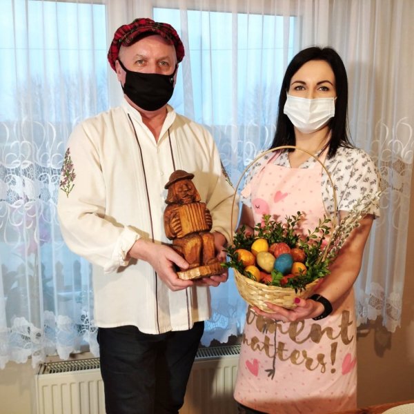 Pani Kamila za sugestią Janko Muzykanta malowała jaja używając takich naturalnych barwników, jak: łupiny cebuli, burak czerwony, szpinak, kurkuma, kapusta czerwona. Jaja kurze uzyskane z kur własnej hodowli wyszły w kolorach: brązu, czerwieni, zieleni, żółci i błękitu. Na zakończenie pracowicie wspólnie spędzonego czasu Janko Muzykant i gospodyni Kamila zaprezentowali swoje świąteczne wyroby w wielkanocnym koszyczku, życząc wszystkim zdrowych i smacznych świąt. Nagranie można zobaczyć na facebooku Gminnego Ośrodka Kultury w Dźwierzutach.