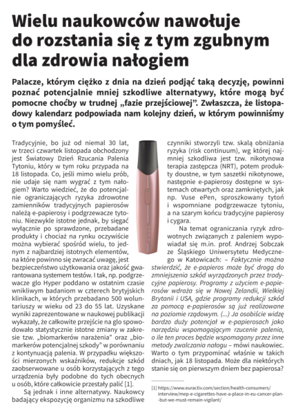Na temat ograniczania ryzyk zdrowotnych związanych z paleniem wypowiadał się m.in. prof. Andrzej Sobczak ze Śląskiego Uniwersytetu Medycznego w Katowicach: – Faktycznie można stwierdzić, że e-papieros może być drogą do zmniejszenia szkód wyrządzonych przez tradycyjne papierosy. Programy z użyciem e-papierosów wdraża się w Nowej Zelandii, Wielkiej Brytanii i USA, gdzie programy redukcji szkód za pomocą e-papierosów są już realizowane na poziomie rządowym. (...) Ja osobiście widzę bardzo duży potencjał w e-papierosach jako narzędziu wspomagającym rzucenie palenia, o ile ten proces będzie wspomagany przez inne metody zwalczania nałogu – mówi naukowiec. Warto o tym przypominać właśnie w takich dniach, jak 18 listopada. Może dla niektórych stanie się on pierwszym dniem bez papierosa?