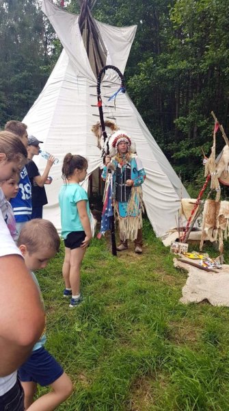W piątek 3 lipca mieliśmy okazję poznać barwną kulturę indiańska. Dzięki gościnności Ośrodka wczasowego DOLOMITY, w lesie nad jeziorem Brajnickim stanęły indiańskie tipi, a wódz Szary Wilk uraczył nas opowieściami z życia rdzennych mieszkańców Ameryki Północnej. Szary Wilk zademonstrował narzędzia i przedmioty codziennego użytku: tipi letnie, tipi zimowe, fajka pokoju. Uczestnicy mogli strzelać z łuku i poznać taniec indiański. Była też możliwość zakupu rękodzieł czerwonoskórych: łapaczy snów, talizmanów i ozdób. Wszyscy się dobrze bawili i mamy nadzieję, że indiańska wioska Kraina Winnetou wpisze się na stałe w krajobraz naszej wsi.