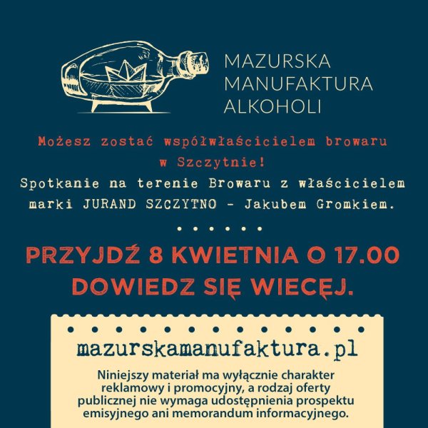 Każdy może stać się współwłaścicielem browaru w Szczytnie. Od wtorku, 2 kwietnia, ruszyła sprzedaż akcji spółki Mazurska Manufaktura, do której należy ten zabytkowy obiekt. Na poniedziałek, 8 kwietnia, na godz. 17 prezes zarządu spółki Jakub Gromek zaprasza chętnych do odwiedzin. Można będzie zwiedzić browar, ale i dopytać o szczegóły akcji.