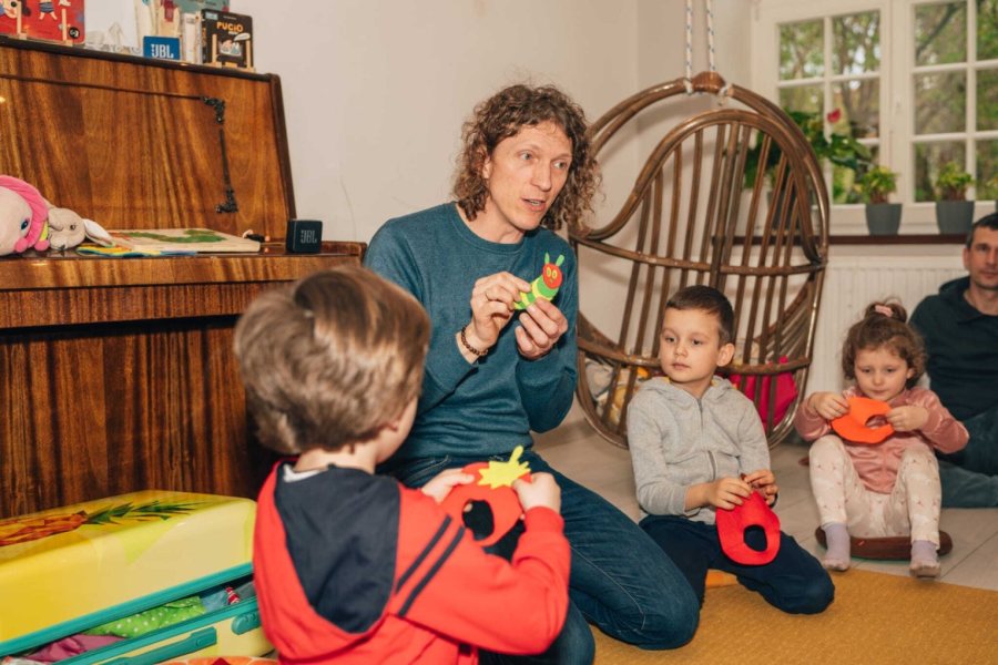 My prowadzimy zajęcia dla dzieci w wieku od 6 miesięcy do 6 lat, podzielonych na grupy: do 3 lat, 3-4 lata i 5-6. W grupie maksymalnie może być 12 dzieci, ale staramy się, by było ich mniej, bo z niewielkimi grupami pracuje się lepiej. Szczególnie dotyczy to dzieci, które nie chodzą jeszcze do przedszkola.