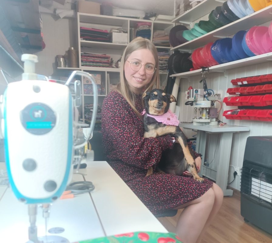 W środku pełne regały z tekstyliami, na ścianie przy wejściu gotowe produkty: smycze, obroże, szarpaki. Uderzają po oczach wyszukanymi wzorami i kolorami. Niektóre mają wyszyte imiona… Leżą też na stole za laptopem, z którego “leci” muzyka. Wszędzie tego pełno. Przy profesjonalnej maszynie Nikola, na legowisku obok jej suczka Cynka i puste miejsce po Nutce…