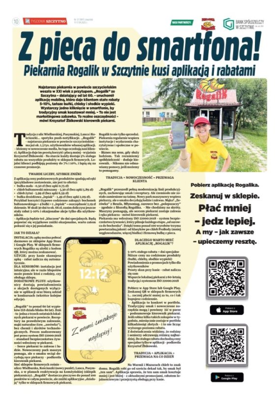 Najstarsza piekarnia w powiecie szczycieńskim weszła w XXI wiek z przytupem. „Rogalik” ze Szczytna – działający od lat 60. – uruchomił aplikację mobilną, która daje klientom stałe rabaty 5–10%, tańsze bułki, chleby i słodkie wypieki. Wystarczy jedno kliknięcie w smartfonie, by tradycyjny smak kosztował mniej. – To nie jest marketingowa zabawka. To realne oszczędności – mówi Krzysztof Żbikowski kierownik piekarni.